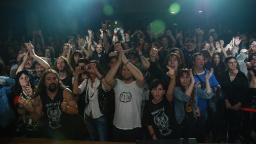 Pero ante todo, en el ambiente flotaba una sensación de nostalgia agridulce. Y es que la felicidad puede ser también triste. Y eso se podia palpar nada más entrar en el recinto: heavys de más de cuarenta años que rendian tributo al querido bajista inmortalizando con sus cámaras la imagen del lado izquierdo del escenario, sobre el cual estaba el cartel del evento, y ante éste, su bajo Gibson y un maniquí de costurero con la chupa roja de cuero y la camiseta con el mítico lema «El heavy no es violencia».
