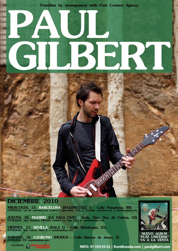 Por fin llegó el gran día en que volveríamos a gozar de la presencia en nuestro país de uno de los guitarristas más talentosos y carismáticos que hayan salido de los USA. Paul Gilbert se presentaba ante su afición con su nueva banda, entre la que destacaba la ausencia de su mujer Emily Gilbert a los teclados, y la incorporación como segundo guitarra y cantante del maestro del blues rock Tony Spinner.