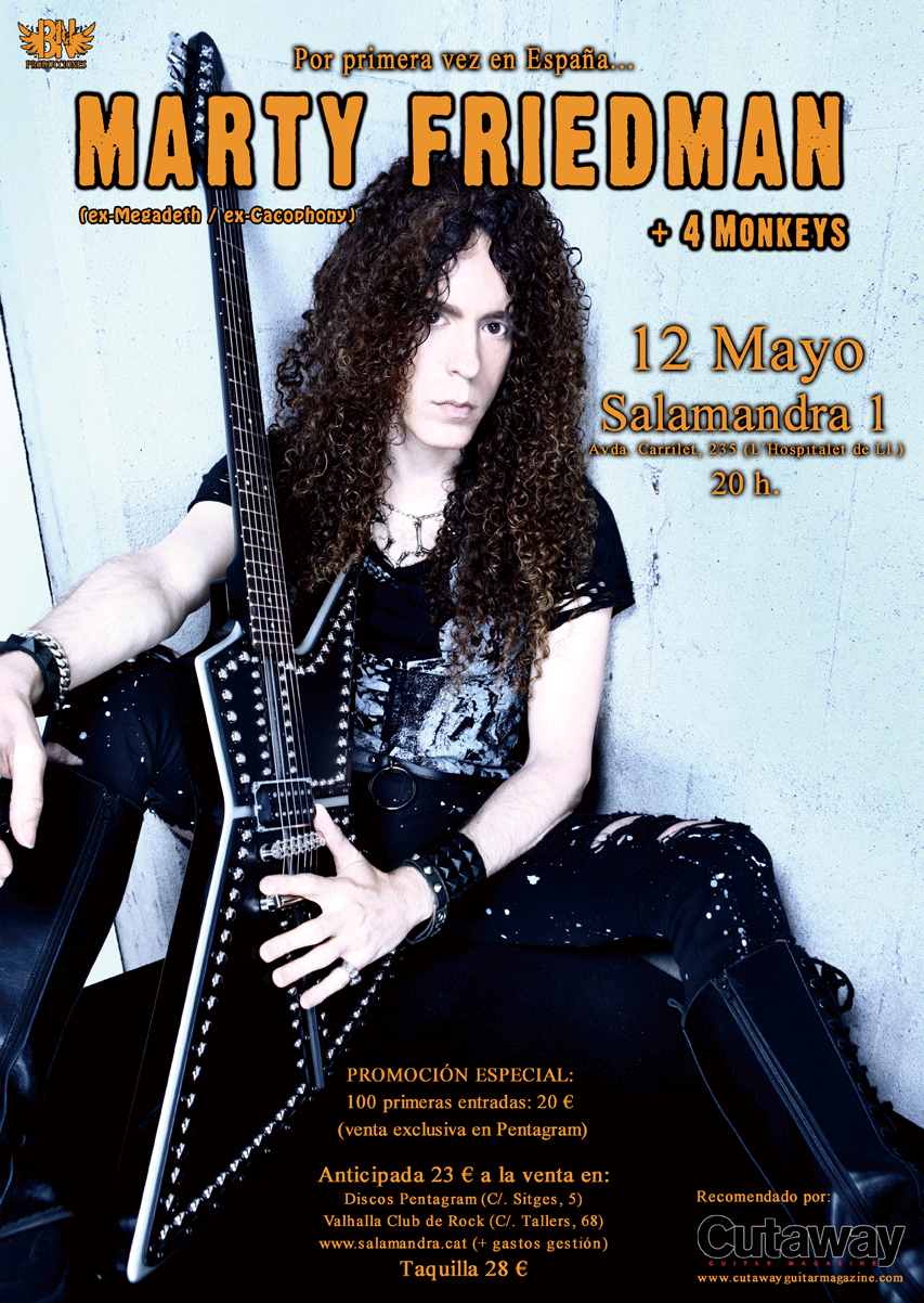 Ya teniamos ganas de ver de una vez a uno de los guitar heroes por excelencia. Cierto es que nuestro país ha acogido a muchos de ellos y que faltan pocos de la lista de imprescindibles (a ver cuando se descuelgan Joey Tafolla o Greg Howe), pero Friedman era el primero en esa lista. Aunque no es del todo cierto que no nos haya visitado. Ya vino con Megadeth en la gira del «Youthanasia» y allá por el 99 realizó un clínic en Salou (Tarragona) de los amplificadores Blue Voodoo de Crate, en el cual no se habló para nada de los amplis y se dedicó -por petición del público- a tocar solos de su ya ex banda y temas del recientito (por entonces) «True obsessions». Aquella ocasión fue la primera entrevista «gorda» que realizamos y nos encontramos ante un tipo sencillo y agradable. O sea, que ya nos habia visitado, pero en versión 100 % solitario no. Y ya tocaba.