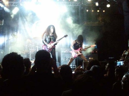 La banda, como es normal y deseable, estuvo a un nivel altísimo. Marty Friedman no acusa la edad y se mantiene igual de contundente y melódico que siempre. El bajista Ryota Yoshinari, pese a la forma de tocar típicamente punkarra (o sea, el instrumento a la altura de los huevos), tocaba sin problemas las complejas líneas rítmicas y animaba mucho a los asistentes acercándose a ellos cada dos por tres y paseando por todo el escenario. Y el batería Mitsuru Fujisawa, cuyo peinado es imposible de definir, también tocó como una bestia, pero además jugó mucho con el público haciendo continuas muecas y gestos.