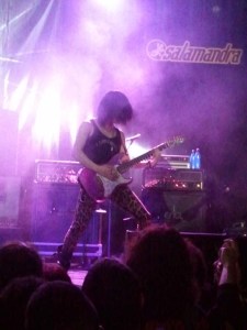 Dejo para al final al segundo hacha. En primer lugar, Takayosi Ohmura es un valiente. Hay que tener mucho valor para salir con una camiseta negra sin mangas, unas mallas ajustadas de tigre auténticamente ochenteras y una ESP estilo Stratocaster con un acabado en purpurina fucsia (aunque después la cambió por una con mástil escalopeado y en un terrorífico acabado dorado). Solo hacia falta un dibujo en el golpeador de Hello Kitty para redondear el asunto. Ya desde el primer momento se encargó de la segunda guitarra en las muchas partes armonizadas que presenta la música de su jefe, doblándole con perfecta precisión («Thunder march» fue el mejor ejemplo). Se agradeció que el americano le diera cancha en algunos momentos, ya que su lenguaje y sonido eran diferentes y eso nos dio un pequeño descanso auditivo. Además, nos permitió disfrutar de un solo muy neoclásico y de una simpática broma: en el penúltimo tema de la velada, el citado «Thunder march» perteneciente al «Dragon’s kiss», Jason Becker colaboraba en dicho tema (de ahí las continuas armonias dobladas), pero además se quedaba por espacio de unos segundos tocando un complejo arpegio marca de la casa. Bien, en esta ocasión, la banda entera se fue a un lado del escenario a hablar entre ellos, dejando a Ohmura casi un minuto tocando ese sweep ronpemanos. Una broma seguro que estudiada pero que quedó simpática. Y como detalle extramusical, decir que sino fuera porque no tenia pecho, hubiera pasado por una mujer. Posiblemente sea el tio más guapo que he visto nunca.