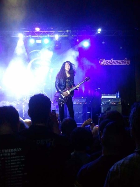 «Street demon» del «Loudspeaker» fue el tema con el que inició el concierto. Una furiosa y alegre fusión de punk y heavy metal con melodías de anime japonés, mostrando el estilo que lleva desde hace años, bastante alejado del metal neoclásico de sus inicios. Durante las siguientes dos horas pudimos disfrutar de la magia que tienen sus dedos, la furia metalera de las partes rítmicas (aunque nos confesara en su día que acabó harto del trash metal en Megadeth, y que a tenor de la tralla que compone, creo que o miente o tiene mala memoria), la complejidad casi progresiva de muchas canciones, la melodía de sus solos, las escalas orientales que le han definido desde siempre y esos megabendings tan bien afinados. Lo que sí destacaria como negativo fue el propio set list. Centrado casi en exclusiva en la época post-«Loudspeaker», obvió por completo al «Introduction» y al «True obsessions» (su álbum más equilibrado) y pasó de puntillas por el «Dragon’s kiss» («Forbidden city», «Dragon mistress» y «Thunder march») y el «Scenes» (la balada «Angel»). Tuvimos un sólo tema vocal y además inédito. «Letter» fue una bonita balada cantada en japonés por el bajista y dedicada a Japón por la reciente tragedia. También hubo un breve momento para el recuerdo de Megadeth con «Tornado of souls», en una versión reducida e instrumental, pero que nos permitió disfrutar del que fue el mejor solo de guitarra de Friedman durante aquella memorable época como trasher. «Thunder march» y «Bad D.N.A.» pusieron la guinda al pastel cerrando la velada.