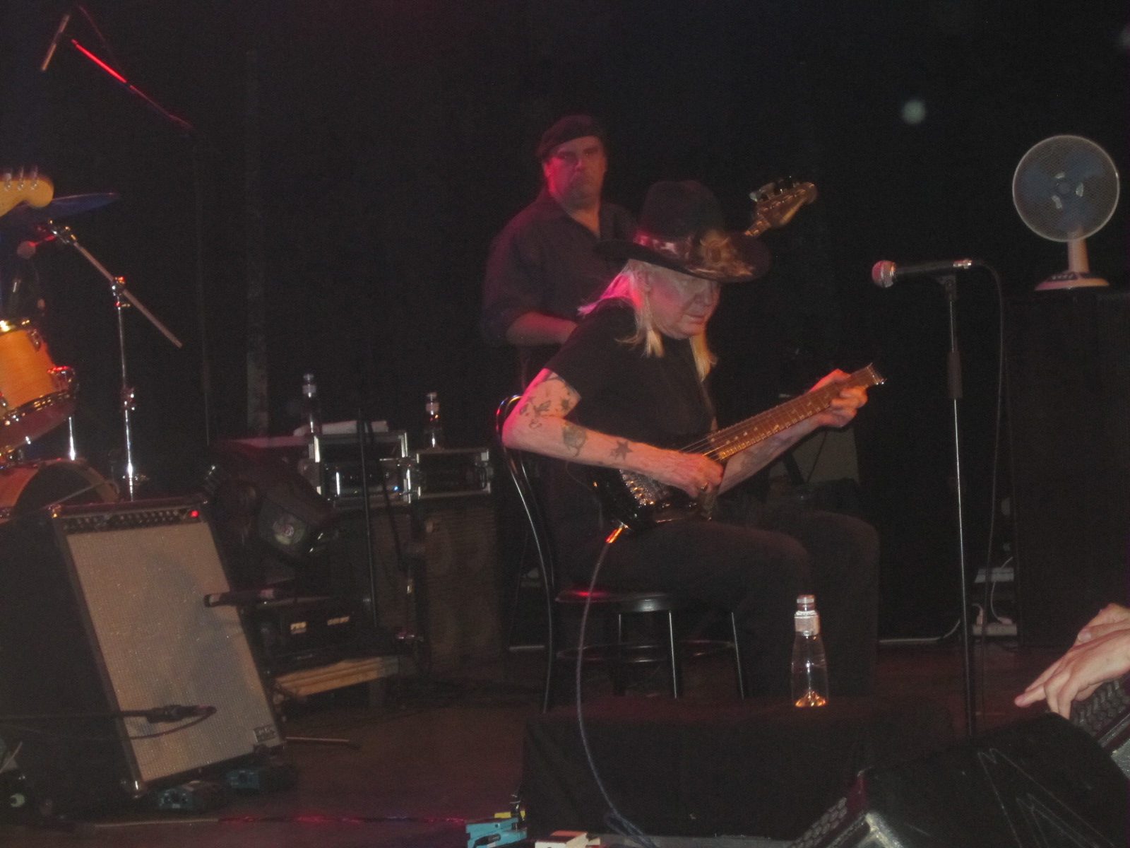 Por problemas de acreditación no pudimos asistir en octubre pasado a su última visita a Barcelona, pero por sorpresa, en menos de un año ha vuelto. La Sala Rasa de la Faktoria d’Arts de Terrassa, con un aforo para unas 200 personas se llenó hasta los topes para ver al mito del blues. Si bien, a ciertos músicos da gusto verlos en espacios más de su categoria, teniendo en cuenta sus actuales condiciones físicas, también daba gusto verlo a medio metro de distancia en una sala tan pequeña. Con media hora de retraso, el bajista Scott Spray, el batería Vitto Luizzi y el guitarista Paul Nelson nos ofrecieron un primer corte instrumental, bluesero, feroz y con éste último soleando desde el primer segundo. Después entró Johnny Winter con su eterna Erlewine Lazer, se sentó y dio paso al clásico «Hideaway» de Freddie King. Solo bastó unas pocas notas para ganarse al público -que ya estaba rendido desde antes de entrar-.