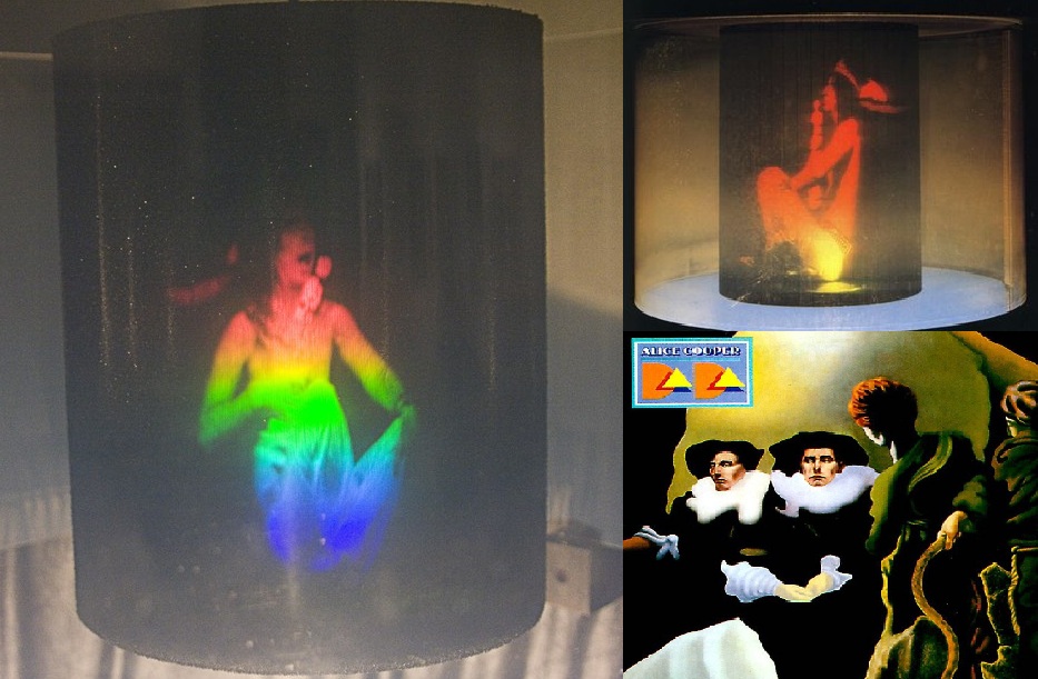 El mito del heavy metal conoció al pintor en un concierto suyo. A Dalí le fascinó toda su imagineria estética: cadenas, cuero, serpientes, sangre, látigos, etc., mientras que Cooper afirmó que era un auténtico rockero por su actitud sorprendente y provocadora. Después de eso la amistad se consolidó cuando Cooper fue invitado por tres días a la casa de Dalí. El resultado fueron dos retratos del rockero en formato holograma titulados «Primer retrato cromo-holograma cilíndrico del cerebro de Alice Cooper» y «Retrato del cerebro de Alice Cooper», y años más tarde, Dalí homenajeado en la portada del disco «Da Da», al coger Cooper un fragmento del cuadro «Mercado de esclavos con la aparición del busto invisible de Voltaire» para la carátula. Para más información sobre esta extraña amistad y aquellos surrealistas tres días os recomiendo que visitéis esta entrada en el genial blog Anécdotario del Rock (y ya de paso que visitéis el blog entero que no tiene desperdicio alguno).