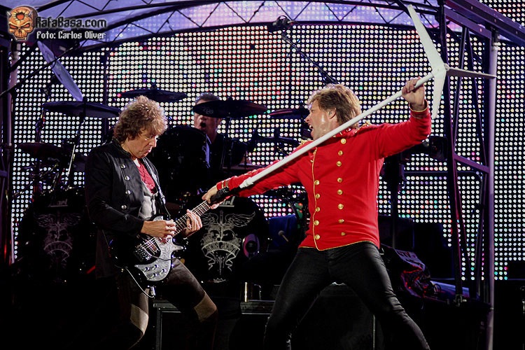 Sobre los músicos, pues bueno, quien tuvo retuvo como he dicho antes. Sambora toca como un demonio y canta con gusto. TorresBryan siguen igual de compenetrados y tocando con tan buen gusto. Hugh McDonald tiene un gran nivel, y si bien es cierto que es estático e incluso apático en su actitud (y mira que tras tres lustros ya podía moverse algo más) tiene nivel de sobra para estar en esta banda. Bobby Bandiera engrandeció el sonido del concierto al complementar a Sambora. Y Bon Jovi, vale que no tiene el poderio vocal de antaño, pero no es menos cierto que cantó muy bien aunque algo plano. Pero mantener un nivel tan alto habiendo pasado el medio siglo de edad y tras tres horas de concierto tiene mucho mérito. Además lució simpatía y sonrisas ante el público desde el primer minuto al último (algún día tendré que ponerme en plan abuelo cebolleta y contar mis aventuras durante los EMAS de 2.002, y como ese día comprobé que Jon Bon Jovi fuera de escena es un completo imbécil).