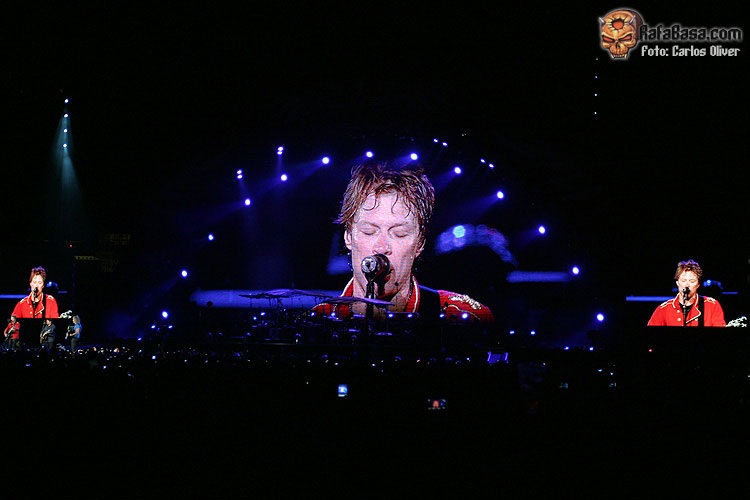 El escenario era bastante normalito para lo que estamos acostumbrados a ver en cuanto a bandas grandes. E incluso destacaban por lamentable dos carpas con un toldo transparente donde estaban «encajonados» McDonald y Torres en una, y Bryan y Bandiera en la otra. Lo que sí fue de agradecer fueron las dos pantallas de los laterales y la enorme pantalla semicircular (cuando digo enorme no exagero) de la parte trasera del escenario. El montaje de imágenes fue muy dinámico en las de los lados, no tanto en la central (la grande) que se centraba especialmente en Bon Jovi o en Sambora en los momentos de los solos. Aunque en ésta podían verse efectos especiales y otras imágenes grabadas en exclusiva para la gira.