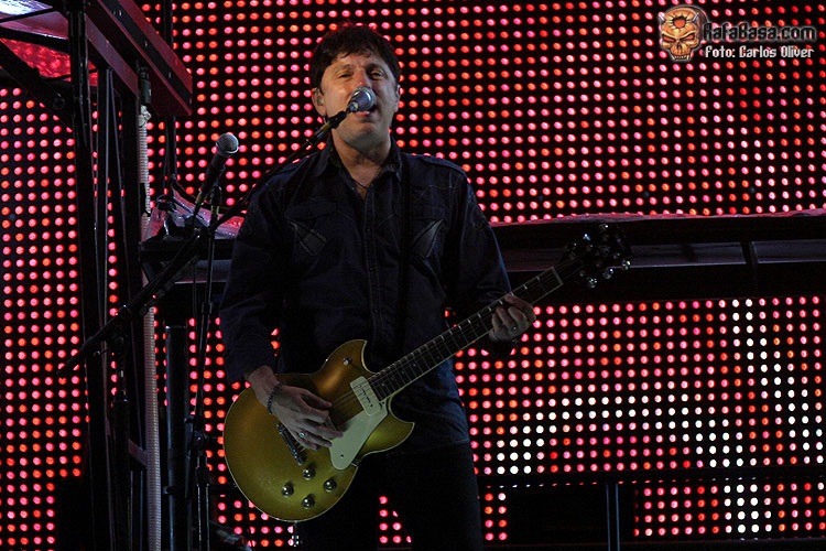 La movida comenzó un poco antes de las 20:00 con la actuación de The Monomes, una banda española con miembros dispersos por toda la geografía y que ensayan por Skype. Pese al problema que esto podría suponer, han grabado ya dos albums con una calidad poco usual para lo que es el rock español actual dominado por un exceso de gafapastismo. Con su flamante nuevo disco «Sweet champagne» bajo el brazo, y que supone su paso a la primera división, al estar producido bajo el amparo de Sony, The Monomes intentó convencer a una audiencia que evidentemente esperaba a quien esperaba, con un sol de justicia, con la iluminación del escenario justita y ante un aforo que apenas llegaba a la mitad de las entradas vendidas. Pese a tenerlo todo en contra, la banda liderada por su vocalista Edward y el batería Rafael Cebrián (amigo y posible rollete/novio de Emma «Hermione» Watson) salió a por todas, con un sonido propio pero del que podían notarse influencias de Foo Fighters, Spin Doctors, Dinosaur Jr.Pearl Jam. No sé si el público aplaudió por cortesía o realmente disfrutó, pero The Monomes ofreció calidad, canciones elaboradas y complejas y una elevada potencia.