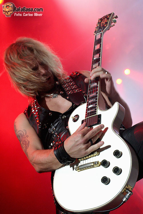 Richard Faulkner salió a por todas. Ya he leído por algún lado críticas a su actitud y sus ganas de chupar cámara. Seguro que si hubiera estado quieto en una esquina también se le hubiera criticado. A ver, ¿es que por sustituir a Downing tiene que clonarlo en todo? Si el resto de sus compañeros son sexagenarios con menos energía que él, ¿debe estarse quieto? En modo alguno vi que quisiera robar protagonismo, y de hecho, en una banda tan estática (Halford solo camina, y lento adémás, y Hill no se movió de su posición en ningún momento) daba gusto ver a alguien que no podía estarse quieto. Más bien lo vi como una autoreafirmación de «estoy aquí, es el sueño de mi vida y quiero disfrutarlo a tope porque solo es una gira». ¿Tan malo es eso? En cuanto a asuntos guitarreros, podía reconocerse la estructura de los solos de K.K. Downing, pero sabía llevárselos a su terreno. Advertí en gestos y en lenguaje una aproximación al sonido de blues y hard rock agresivo de Zakk Wylde (hasta toca con Gibson Les Paul) y de inmediato me vino a la mente la bizarra idea de que éste podía haber sido guitarrista de Judas Priest. Sigo sin tener claro si Faulkner era el guitarrista ideal para los Priest, al revés de lo que pasó con Owens, que era evidente que era el cantante ideal para la banda, pero ha superado el marrón de sustituir a última hora a un histórico con nota alta.