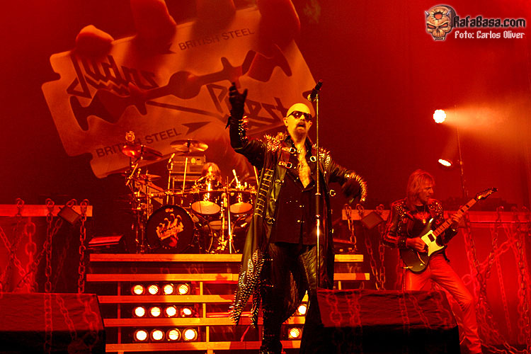 Rob Halford. El Metal God. La Voz (con permiso de Sinatra). El Símbolo del heavy metal. La esencia del heavy metal encarnado en cantante. Cualquier cosa que haga va a provocar una enfervorecida pasión entre sus fans. Pero como uno está harto de los mitos, vamos a hablar tanto de lo bueno como de lo malo. Halford no es un niño y muchos de los temas son muy comprometidos vocalmente hablando. En este sentido fue muy inteligente de reservarse. Aún es capaz de llegar a esos agudos de antaño, pero también es cierto que conservaba energías limitando esos momentos a frases en concreto o gritos muy cortos y moviéndose sobre el escenario siempre con calma, con mucha calma. De esta manera, temas como «Judas rising» o «Painkiller» sonaron muy dignamente. Por cierto, respecto a este último, fue precedido por el mítico «Breking the law» con el micro apuntando al público y sin que él cantara ni una nota. El público se lo pasó en grande haciendo de improvisado cantante, pero a Halford se le vio el plumero en el sentido de que necesitaba descansar para acometer con solvencia el momento más difícil de la noche. La jugada le salió muy bien, porque pese a no ser el Halford de hace veinte años ni ser tampoco un Owens, ha sido el mejor «Painkiller» que hemos oído en años. Fuera ya de aspectos musicales, resultó divertido el continuo pase de modelo que nos hizo, cambiando de americana en casi cada canción. Doradas, de cuero, con efecto tornasol, e incluso plateada y cubriéndole todo el rostro en plan monje satánico para cantar «Judas rising». Lo que no fue tan divertido fue el ver la escasa compenetración que existe entre él y la banda. Tal vez quede algo de resquemor por su marcha (aunque la reunión se produjo en 2.004) o hayan tensiones internas tras la inesperada fuga de Downing, pero lo cierto es que el hombre paseaba por el escenario como si fuera el mismísimo Dios encarnado y el resto sus lacayos, pasando totalmente de éstos. Aunque curiosamente, al que más se le acercó fue al novato Faulkner (no, no estoy insinuando nada gay), algo menos a Tipton y nada a Hill. ¡Ah! y una vez subió las escaleras para cantar al lado de Travis. Entre eso y que la edad no le permite moverse con energías, daba la sensación de que el grupo iba por un lado y él por otro.