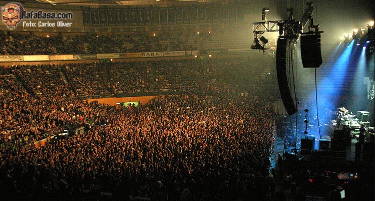 Así que tras pagar más de 60 € de entrada, cuyos gastos de tramitación ascienden a la escandalosa cantidad de 7,20 € (gracias a la cada vez actitud más mafiosa de TicketMaster y a la negativa de la promotora Rock and Rock a acreditarnos) nos plantamos dos horas antes en el Estadi Olímpic de Badalona, también conocido como el estadio del Juventut de Badalona. Pese a que en los accesos al estadio no hay ni una sombra y la temperatura rondaba los 35º con un cielo despejado, las largas colas presentaban un único color. Camisetas negras, pantalones negros y botas negras, mucha greña, bastantes calvas de veteranos, algún aventurero que se atrevía a lucir una chaqueta vaquera (llena de parches, por supuesto), una media de edad superior a los 40 (aunque de un tiempo a esta parte pueden verse más jóvenes en conciertos de metal clásico) y los lateros magrebíes haciendo el agosto y demostrando que el heavy metal siempre estará asociado a Estrella Damm, eran los elementos que podían verse aquel día. La primera polémica del día fue lo de los jodidos 7,20 €. La segunda fue las dos colas que separaban las entradas de gradas y de pista, habida cuenta de que el precio era el mismo y que después no había vigilancia alguna que impidera pasar de grada a pista y viceversa. La tercera fue una estratégica apagada de aire acondicionado que nos proporcionó a mi y mis acompañantes tal agobio, que antes de empezar la música y los apretujones, ya nos planteábamos muy seriamente abandonar la pista para ir a sentarnos a las gradas. Claro que ello consiguió su objetivo, y fue que las barras obtuvieran una recaudación récord. Aunque el problema fue que sólo habían dos, y encima debías hacer una cola kilométrica para sacar los tickets y otra más para adquirir tu bebida. Esto hizo que mucha gente se perdiera los comienzos de los conciertos. Menos mal que el aire acondicionado comenzó en cuanto se apagaron las luces.