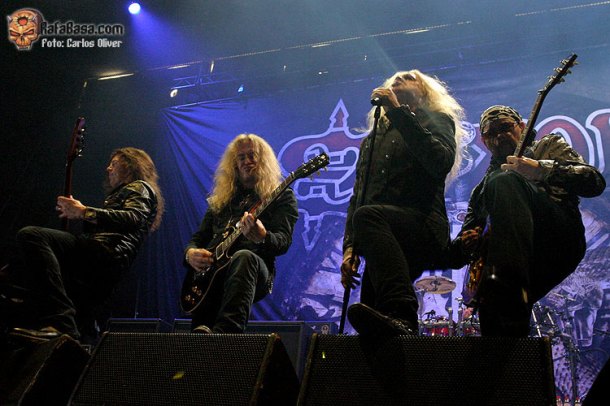 Tras media hora de retraso y con una entrada de sonidos electrónicos e industriales y unos rayos lasers, aparecían sobre el escenario el líder «Biff» Byford, el bajista Nibbs Carter, los guitarristas Doug Scaratt y Paul Quinn y el batería Nigel Glocker. El primer tema de la noche fue «Hammer of the gods», single de su reciente «Call to Arms» y pese a ser un tema aún no demasiado escuchado, la gente ya estaba rendida a sus pies desde el primer acorde. Nunca llueve agusto de todos, está claro, y en una banda con una discografía tan extensa siempre van a faltar temas, pero teniendo en cuenta que solo tocaron una hora, no nos parece muy normal que al menos tocaran cuatro temas de este nuevo álbum. Sonaron geniales no digo que no, pero aún así, este tipo de set lists deben de realizarse bajo el prisma de un festival, aunque no sea un festival propiamente dicho. Así, durante la hora escasa, pudimos disfrutar de clásicos y nuevos temas como «Never surrender», «Chasing the bullet», «Back in ‘79», «Call to arms», «Heavy metal thunder», «Crusader» o «Wheels of steel».