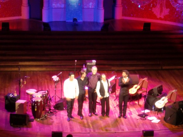 Esto es lo que nos ofrecieron en un directo en el cual desgranaron todo el disco. Con un aforo lleno a tres cuartos y unos minutos de retraso, aparecieron sobre el escenario los dos maestros acompañados de la banda. Banda formada por los percusionistas Bandolero y Juan Carmona y el guitarrista Josemi Carmona. Estos dos últimos, hijos de Habichuela; y por cierto, Bandolero es también percusionista en la banda de Josemi Carmona (de cuyo concierto celebrado durante el 22 Festival de Guitarra de Barcelona puedes leer su crónica aquí).