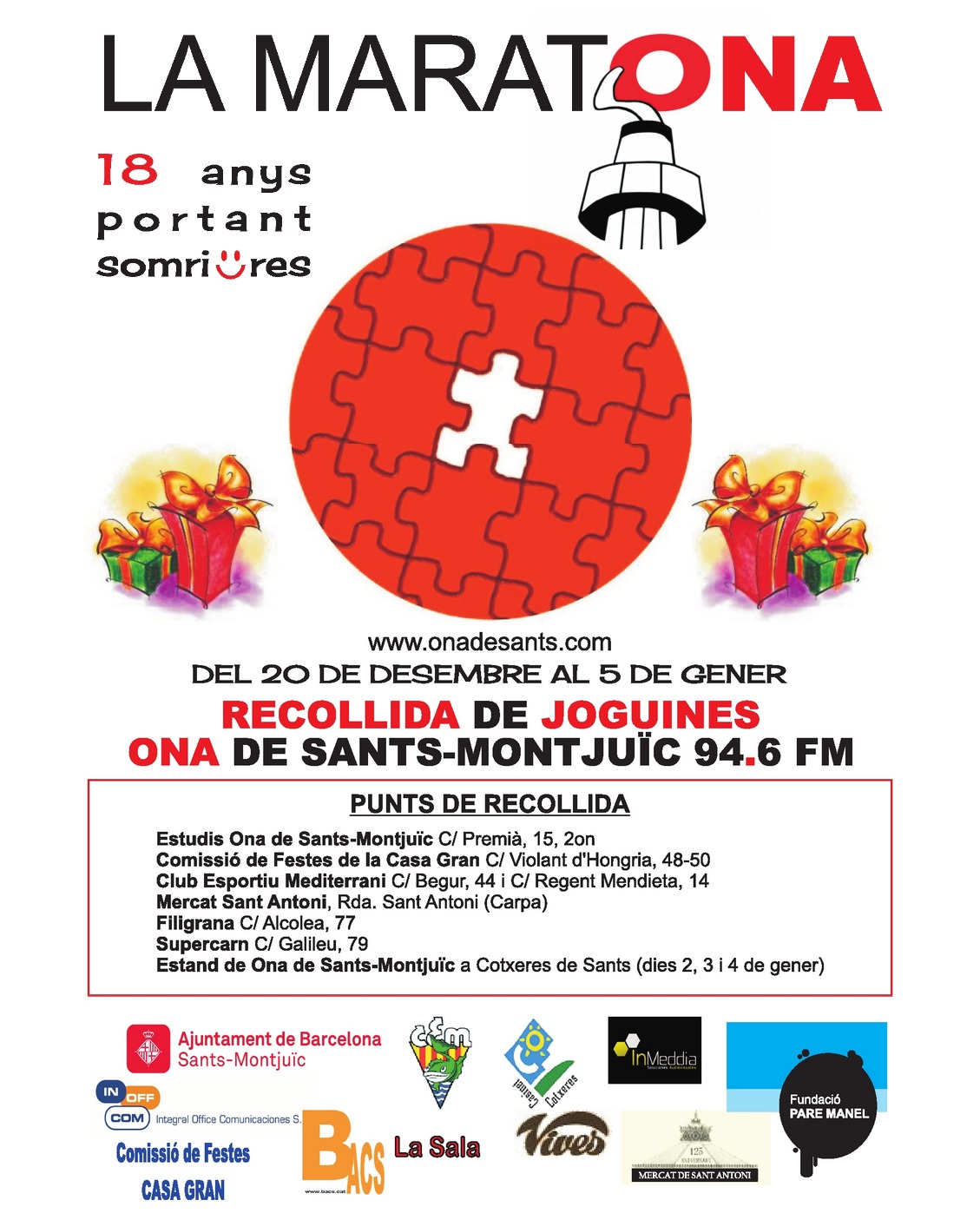 Y ya que estamos recordamos que la maratón de emisión en directo es la conclusión a la tradicional MaratOna Solidaria de Recogida de Juguetes que organiza nuestra emisora, la Ona de Sants-Montjüic y que comenzó el pasado 20 de diciembre. MaratOna que celebra su mayoria de edad y lo hace como siempre intentando cumplir el lema: «un juguete, una sonrisa».