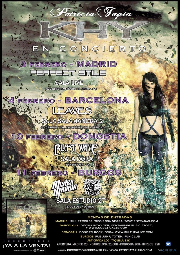 Y tras diez minutos para el consabido cambio de backline y la colocación de dos pancartas a los lados que mostraban media cara de Tapia (algo inútil, puesto que los mismos músicos las tapaban al ser el escenario de pequeñas dimensiones), salieron a escena los KHY, o lo que es lo mismo, Patricia Tapia (voz), Óscar Pérez (batería), Jaime de la Aldea (guitarra solista), Juan Guadaño (teclados y coros) y los nuevos fichajes, Javier Sane (bajo y coros) y Juan Sánchez (guitarra rítmica y coros). Comenzaron fuerte, con una descarga de metal moderno como son los temas «Principio sin final» y «Entre cristales» que sonaron seguidos, y continuaron con un exhaustivo repaso a sus dos discos. «Sin ti», «En la inmensidad», «Promesas olvidadas» o «Despertaré», y las versiones de «El violín del diablo» de Mägo de Oz y «Beat it» de Michael Jackson hicieron las delicias del público que llenó el aforo sólo al cincuenta por ciento de la sala (algo desgraciadamente típico en Barcelona), pero que devolvió al grupo toda esa energía en forma de continuos aplausos y gritos de admiración, dirigidos muchos de ellos en especial a su menuda vocalista. No tuvimos ni a Fran ni a Carlitos de los Mägo de invitados ni interpretaron nada de Metallica como en el concierto del día anterior en Madrid, pero aún así el set-list fue excelente. Otro tema destacable fue «Cuando se apague la luz», un momento de lo más emotivo. La que es una de las mejores baladas de los últimos tiempos nos puso la piel de gallina con la interpretación y el feeling que mostraban Patricia a la voz y Guadaño a los teclados. Lástima que la jodieron los capullos asistentes que estaban hablando a grito pelado en la barra (¿pero habían ido a un concierto de heavy metal o a hablar del puto fútbol?). Algún ¡schhh! pudo escucharse por parte de algún fan que sí deseaba disfrutar de la balada. Menos mal que el segundo tramo de la canción vino con sorpresa, puesto que la banda entró a lo bestia y por sorpresa, a contagiar de poderío metalero una melodía tan hermosa.