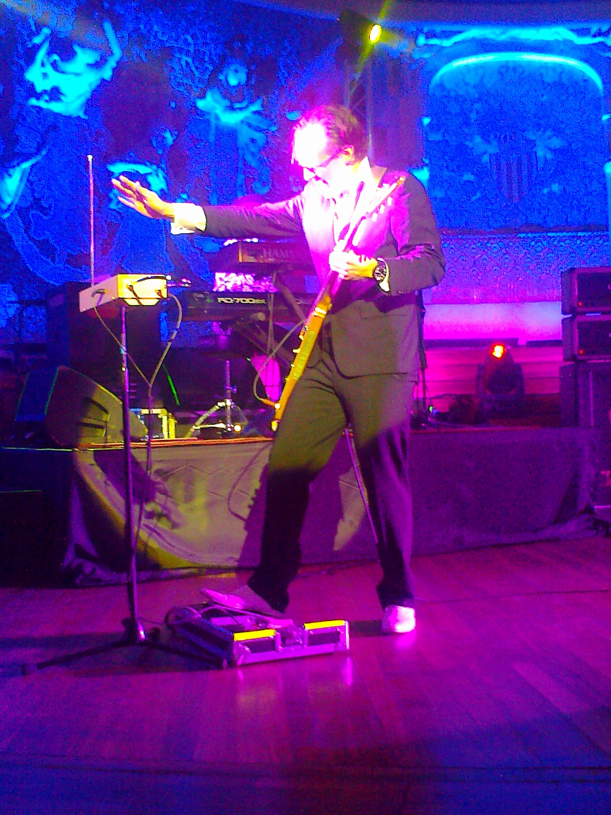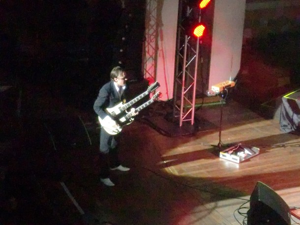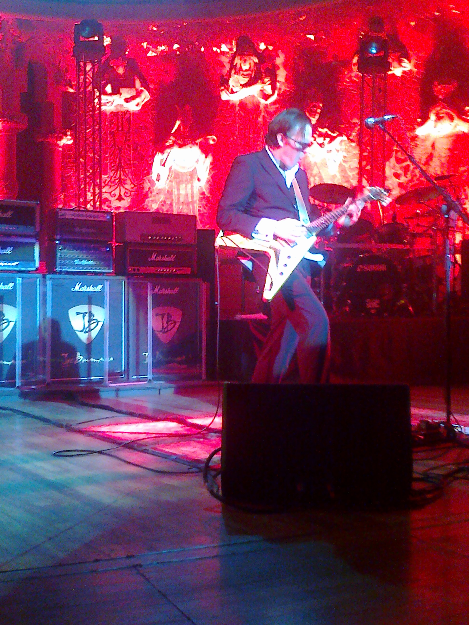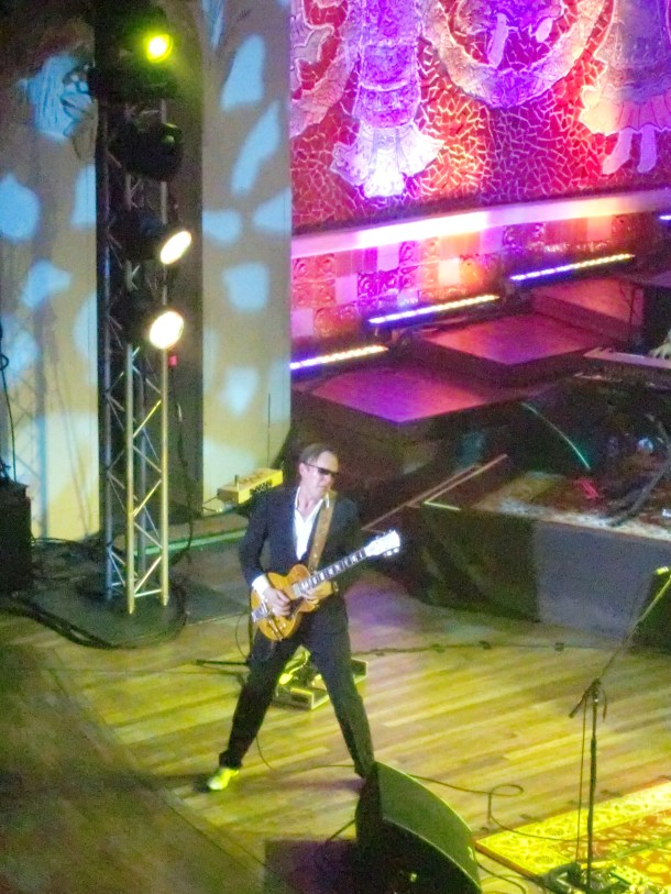 En cuanto a aspectos técnicos, es digno de alabanza el juego de luces durante todo el concierto. Si bien la arquitectura del Palau de la Música ya ayuda, la coreografía de luces fue en todo momento excepcional, enfatizando las sensaciones transmitadas por la música. A nivel de sonido no me arriesgo a dar una opinión muy objetiva. La zona en la que estábamos ubicados los de la prensa tenía una visibilidad muy mala (imaginaros que pese a tener butacas debiamos estar todo el rato en pie para poder ver solo la mitad del escenario; ahora comprendo eso de «palco sin visibilidad») y eso también afectaba al sonido. Si bien desde aquella posición la mezcla ya era mejor que en muchos conciertos a los que he asistido estando bien ubicado, es de suponer que desde la platea el sonido sería soberbio. Hay que destacar también la gran variedad de guitarras que lució Joe. Como si se tratara de un modelo de pasarela, en casi cada canción cambiaba de instrumento, aunque con preferencia por Gibson: Les Paul con y sin vibrato Bisgsby, SG de doble mástil (seis y doce cuerdas), Flying V, Firebird y para complementar, Fender Telecaster, Music Man, Yamaha e incluso una con cuerpo de Les Paul y el clavijero muy largo y las seis clavijas dispuestas horizontalmente en la parte de abajo (si alguien sabe de que modelo se trata que lo diga en los comentarios). Y como curiosidad, juraría que no empleó ninguna de sus Les Paul Signature Series.