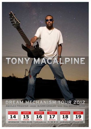 Es un placer traeros la crónica de uno de los conciertos de guitarra más importantes de los que podremos disfrutar en este 2.012. Por varios motivos se hacía muy apetecible asistir a la segunda visita a nuestro país del virtuoso guitarrista estadounidense y pionero del shred neoclásico Tony MacAlpine (segunda si no contamos claro con las visitas como guitarrista de apoyo y teclista en las giras de Steve Vai, o en el proyecto junto a Billy Sheehan y Virgil Donati llamado Devil’s Slingshot). En primer lugar por la edición hace pocos meses de su nuevo disco instrumental en estudio -homónimo y cuya crítica puedes leer aquí-, en segundo lugar por la celebración de los 25 años de su primer y magnífico disco “Edge of Insanity”, y en tercer lugar por la incorporación en su banda de músicos de reconocido prestigio: Aquiles Priester a la batería (ex Angra y candidato a ser miembro de Dream Theater), Bjorn Englen (ex Soul Sing e Yngwie Malmsteen) y Nili Brosh, joven destacada de la «generación youtube» y apadrinada por Andy Timmons.