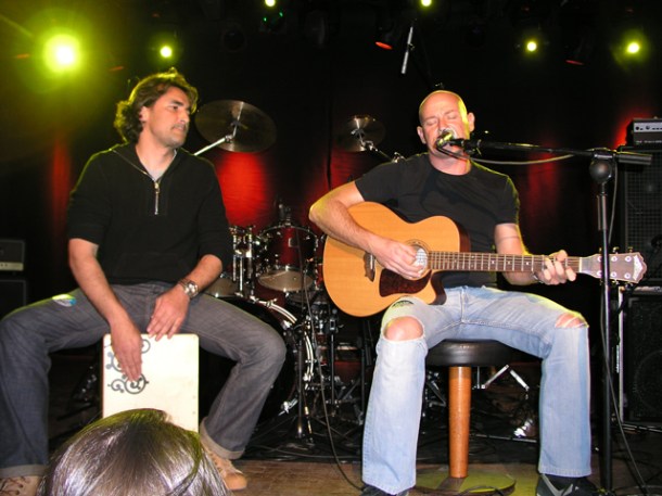 Elucubraciones aparte, The Aristocrats fueron teloneados por el guitarrista Taky Theilacker, que desconozco de quien fue la idea de traerle, pero que no fue del agrado de casi nadie. Puntualmente salieron a escena un guitarrista y un percusionista. El guitarrista se presentó con acento inglés y hablando con mucho esfuerzo en catalán. Tocaba con acústica (Washburn, creo) y su compañero le acompañaba al cajón. Tocaron un blues instrumental bien elaborado. Cuando acabó el primer tema, el guitarrista se presentó en un perfecto castellano: el hablar como extranjeros había sido una broma graciosa. A partir de aquí empezaron a desgranarse temas que forman parte del primer disco de Taky Theilacker, titulado «The 1st & the… next» acompañados de una versión de Stevie Ray Vaughan. El guitarrista demostró que el blues puede ser un estilo mucho más complejo y menos sencillo de tocar de lo que parece, con toda una exhibición de acordes la mar de complejos.