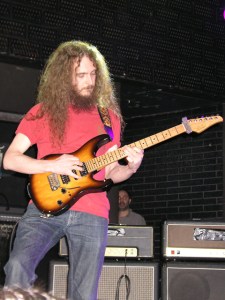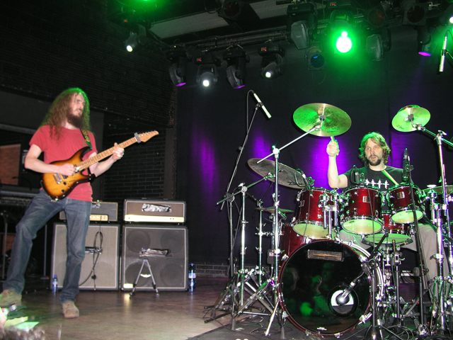 A partir de aquí sonaria durante hora y cuarenta minutos casi al completo el álbum más tres temas de trabajos propios de Bryan («Greasy wheel» de su disco de 2.008 «Thanks in advance»), Marco («Mr. Kempinski» de su disco de 2.006 «Broken orange») y Guthrie («Erotic cakes» de su disco también de 2.006 «Erotic cakes») y un espectacular solo de batería. Dicho solo estuvo integrado dentro del movido tema «Blues fuckers», previo al cual, Minnemann comentó como se lo habian pasado de bien desmontando y desestructurando la estructura clásica del blues. Cabe destacar que la banda no nos deleitó con la maravillosa «Waves» -tal vez lo más cerca que ha estado Guthrie Govan de conseguir un hit-, sino, como hemos comentado unas líneas atrás, con la canción que da título a su único álbum en solitario, el «Erotic cakes». Y es destacable ya que en los set-lists de otros conciertos de esta gira sí que la han tocado. El concierto en sí fue bastante lineal: todas las canciones son en extremo complejas en las que sobre una base de jazz fusión se mezclan otros estilos como el rock, el blues, el metal, el progresivo e incluso el country. Todas las canciones tienen melodías elaboradas pero lo que se agradeció fue el alto nivel de improvisación que presentaron todas, especialmente por parte del guitarrista, al cual vimos mucho más guitarrero que en el disco. Al finalizar la entrevista nos hizo un comentario referente a que se veía obligado a tocar con un ampli Marshall alquilado (JCM, aunque no recuerdo que serie), y tras el concierto y la firma de autógrafos nos comentó que no se había sentido muy satisfecho con el sonido y que ese ampli era «muy Hendrix«, que no servía para lo que ellos querían hacer. Pues bien, tal vez esa fuera la razón por la que Guthrie sonara tan rockero independientemente del solo que estuviera tocando. Y lo cierto es que se agradece.