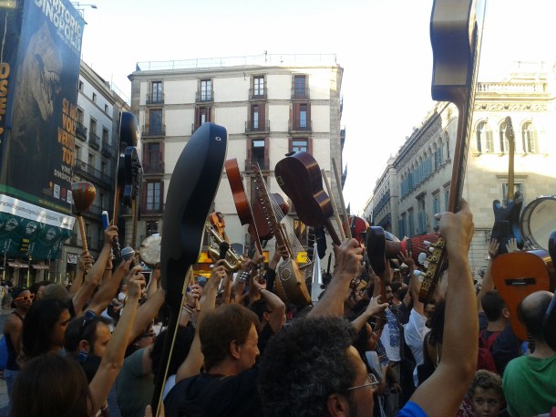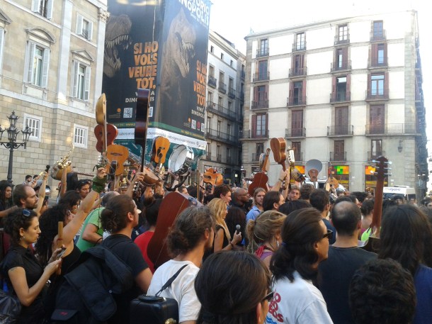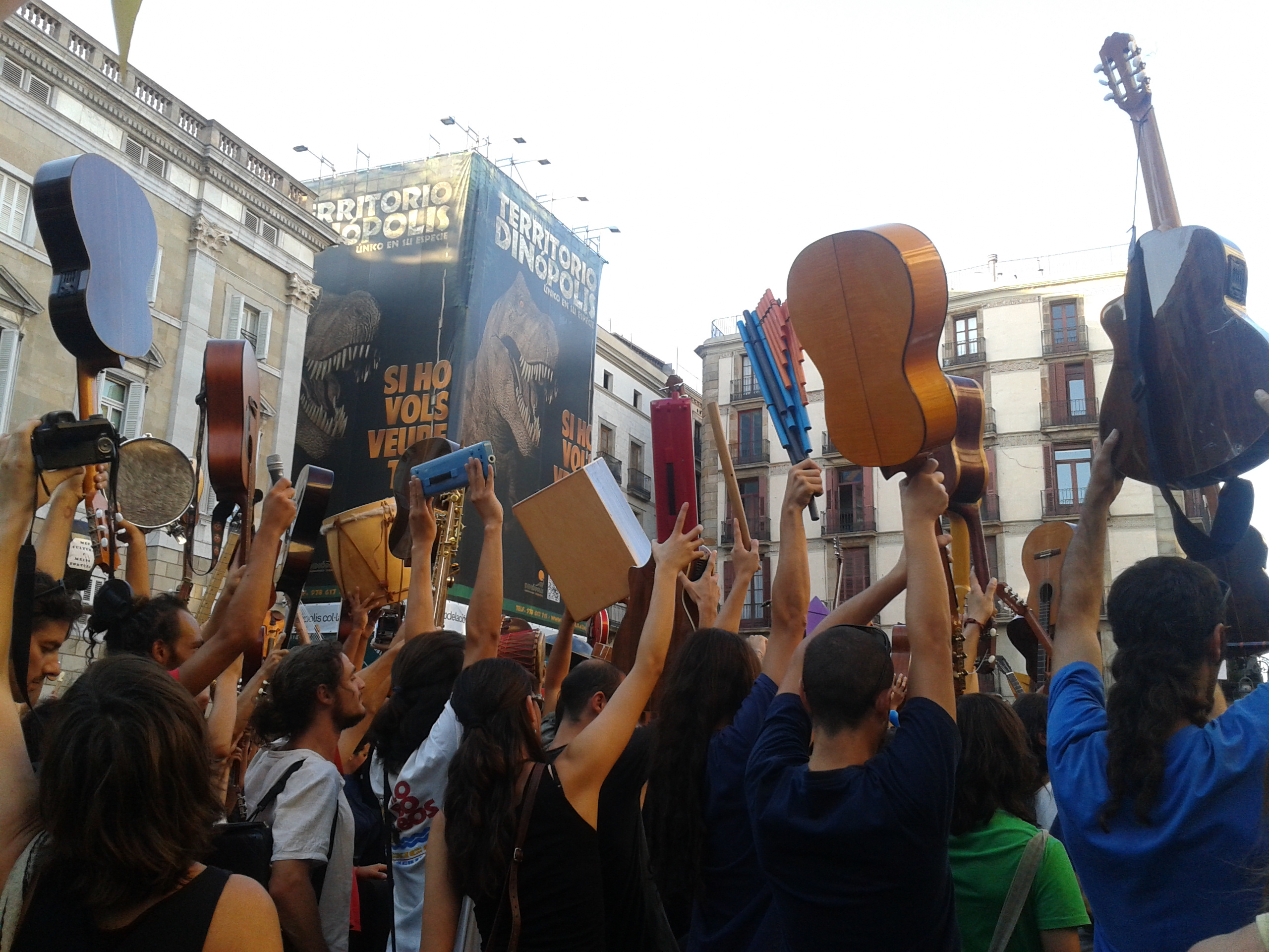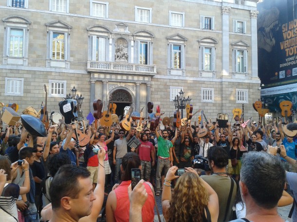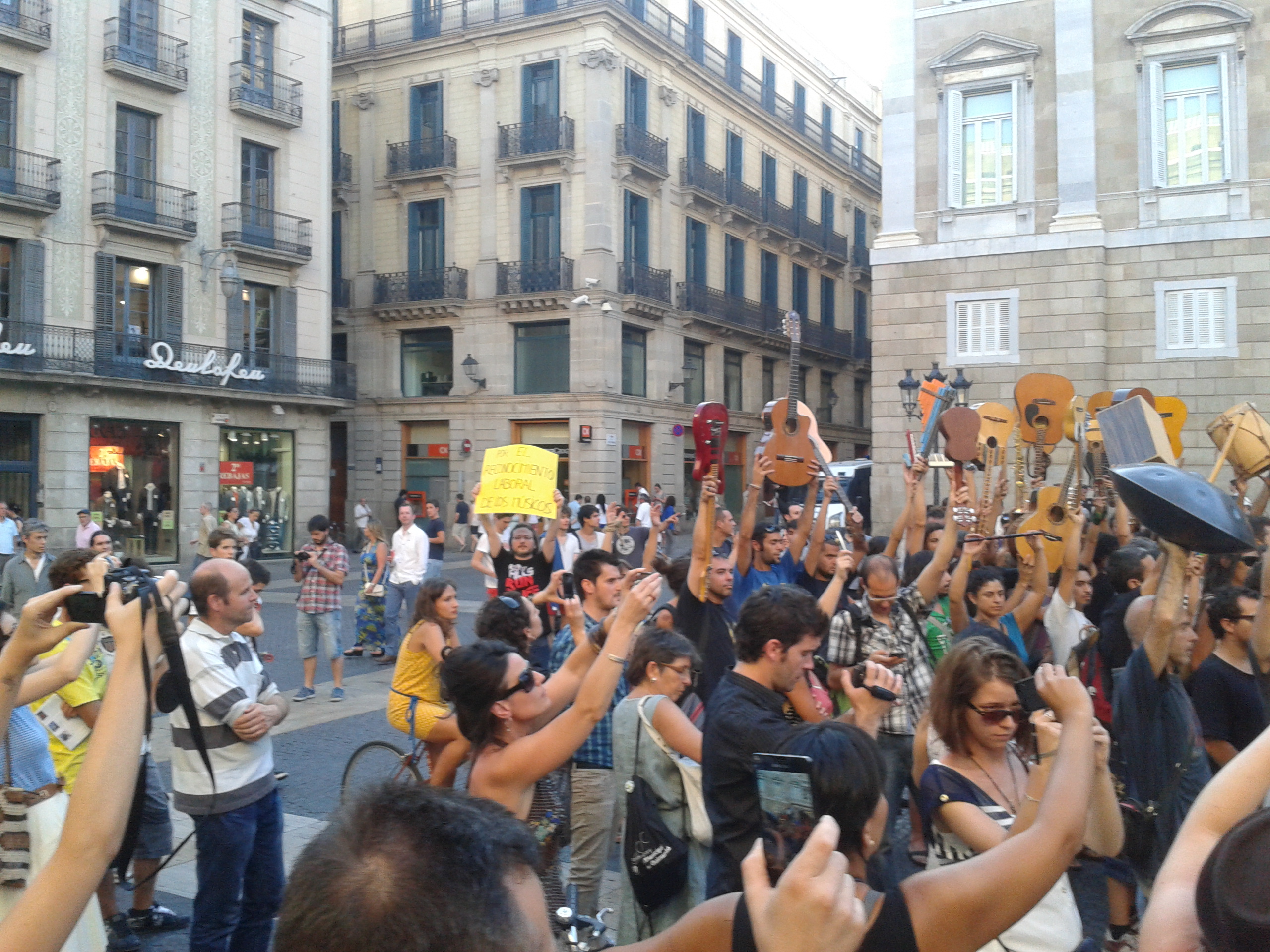 En otro orden de cosas, este pasado miércoles 20 de julio se organizó en Barcelona a través de las redes sociales una flash-mob. Citados desde días antes, unas cien personas se plantaron en la Plaça Sant Jaume ante el ayuntamiento para criticar toda esta situación de una manera muy original: cada persona llevó un instrumento y durante dos minutos los alzaron por encima de sus cabezas, en completo silencio y sin decir nada. Todo discurrió de una forma pacífica e incluso pudo comprobarse el interés que manifestaron algunos de los policías presentes en la zona (en dicha Plaza está el ayuntamiento y la sede de la Generalitat) e incluso el apoyo moral que daban al acto.